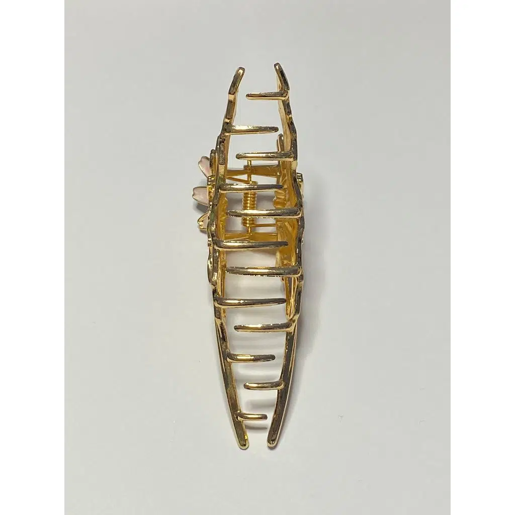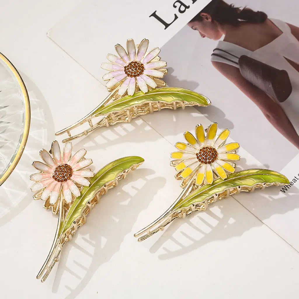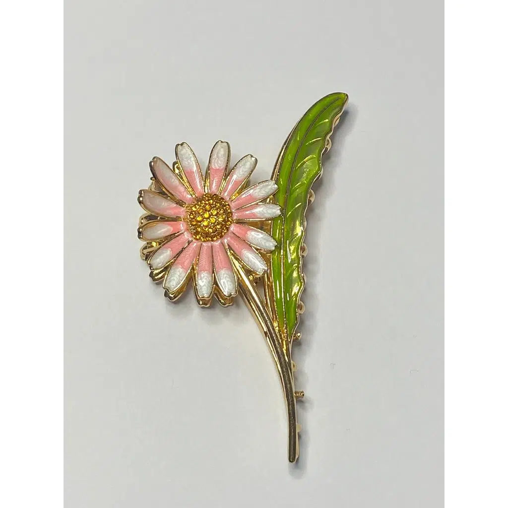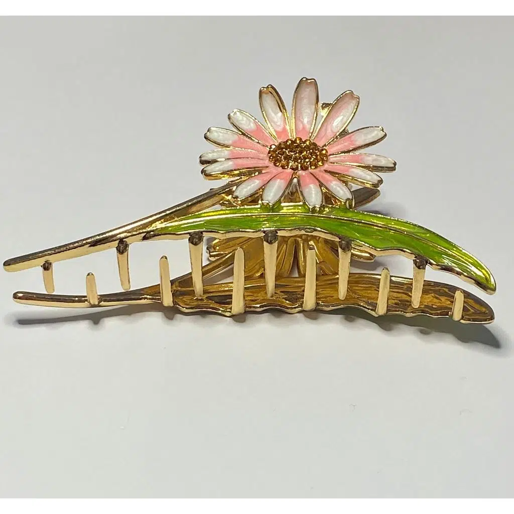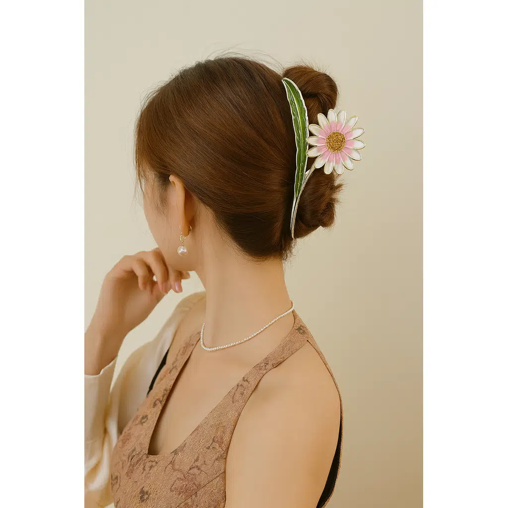 11 cm Pembe Papatya Model Saç Tokası, pastel tonlardaki pembe beyaz çiçek yaprakları ve yeşil yaprak detayıyla kadınsı bir şıklık sunar. Parlak metal gövdesi, sağlam mandal yapısı ve kaliteli emaye kaplamasıyla hem şık hem dayanıklıdır.