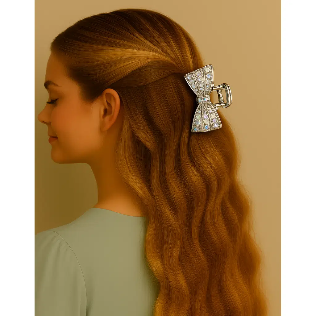 4 cm Gümüş Fiyonk Saç Tokası, göz alıcı taş detayları ve gold rengiyle saçlara şıklık katar. Fiyonk formundaki modern tasarımı, feminen bir dokunuşla zarafeti buluşturur. Parlak taşlar ışığı her açıdan yansıtarak dikkat çekici bir görünüm oluşturur.