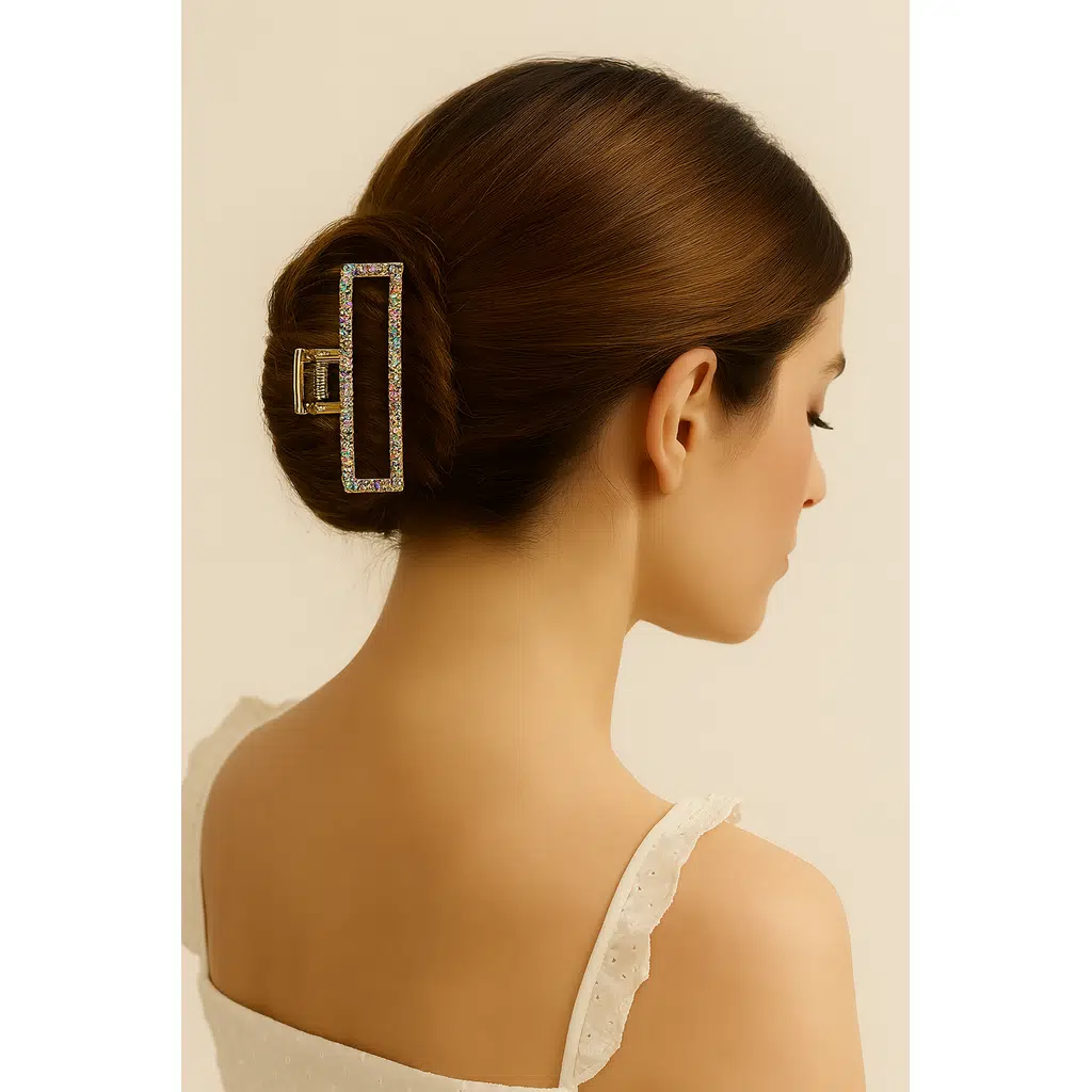 7 cm Renkli Taşlı Dikdörtgen Gold Saç Tokası, sade tasarımına rağmen renkli taşlarıyla dikkat çeken, zarif ve modern bir görünüm sunar. Gold metal çerçevesi, renk geçişli taşlarla birleşerek her saç rengine canlılık ve ışıltı katar.
