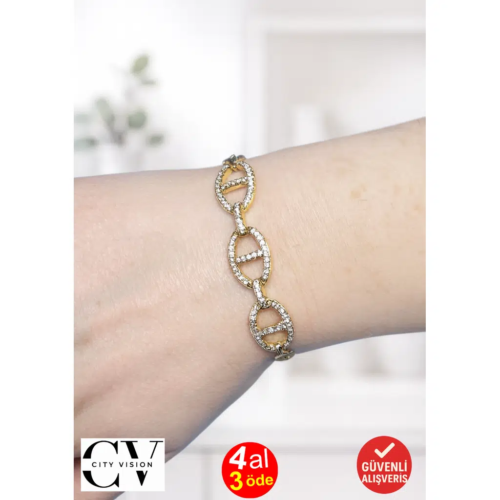Altın kaplama, kristal taş detaylı çelik bileklik; hem günlük stilinizde hem de özel davetlerde ışıltınızı vurgular.