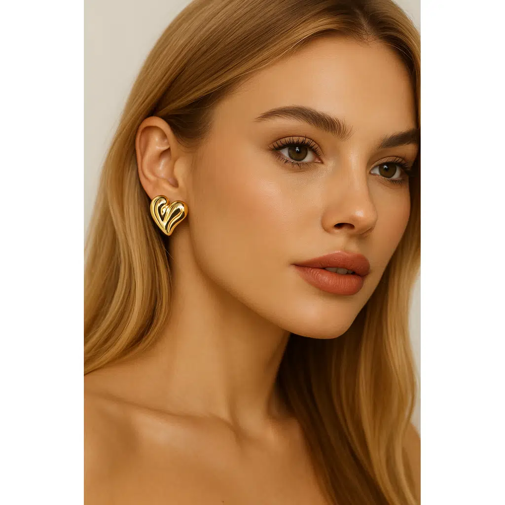 Parlak altın tonundaki paslanmaz çelik kalp küpe, zarif tasarımıyla hem günlük stilinizi hem de özel gün kombinlerinizi göz alıcı bir şekilde tamamlar. Antialerjik yapısı sayesinde gün boyu rahatlıkla kullanılabilir, cilalı yüzeyi ışığı mükemmel yansıtarak yüz hatlarınıza ekstra bir ışıltı katar.