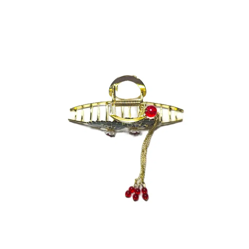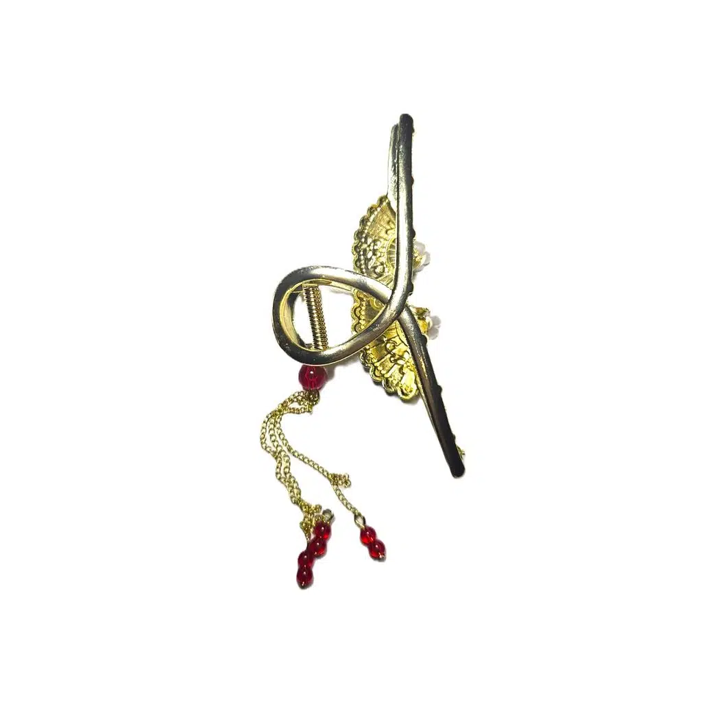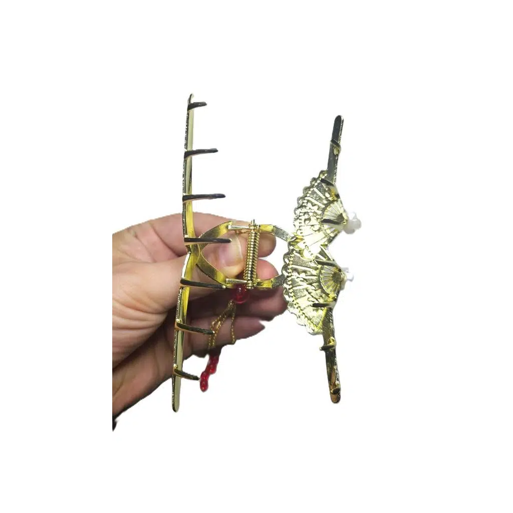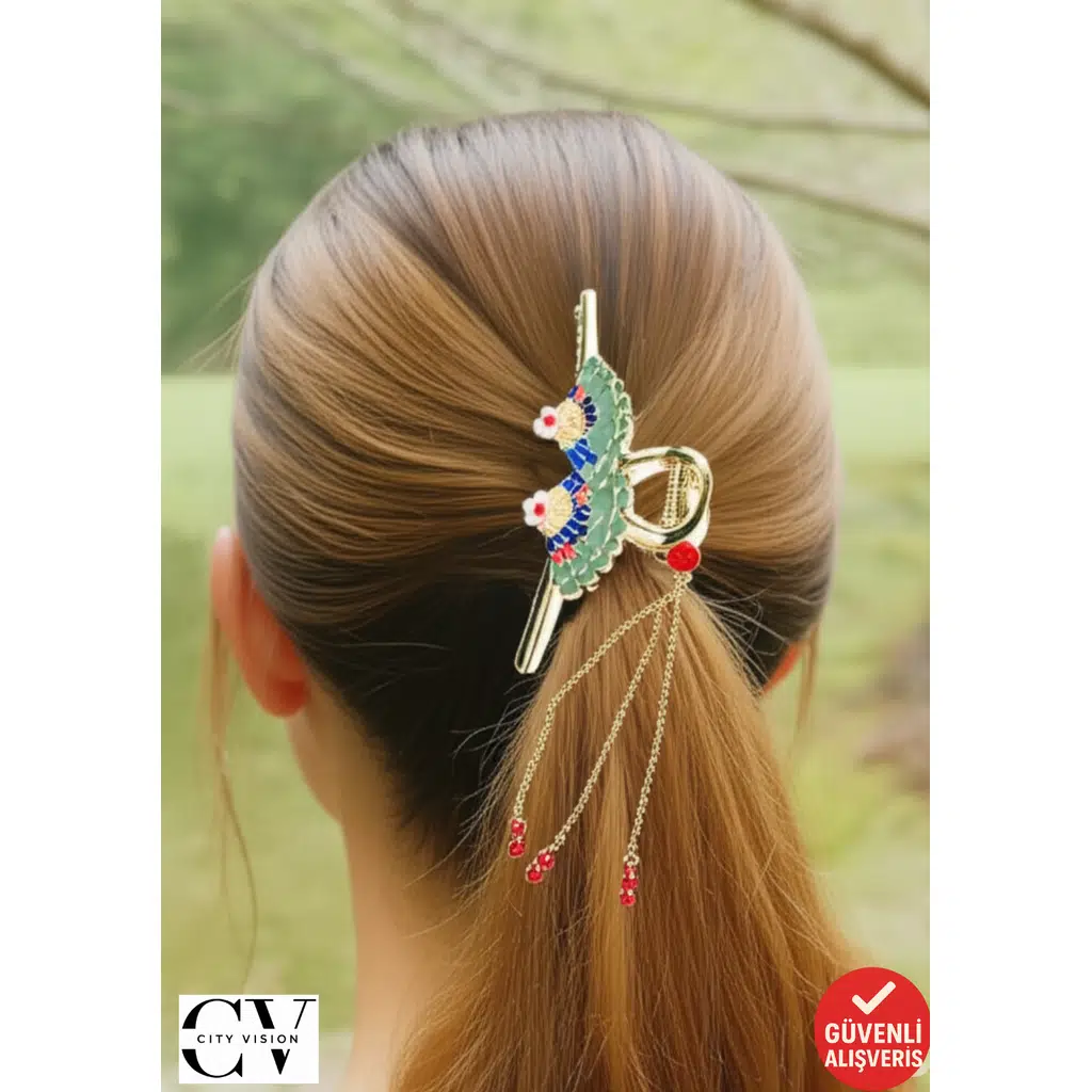 Geleneksel estetik ile modern şıklığın buluştuğu bu Japon yelpaze figürlü saç tokası, özgün tasarımıyla saç stilinize zarafet katıyor. Altın renkli gövdesi, yeşil tonlardaki yelpaze detayları ve kırmızı boncuk süslemeleriyle öne çıkan toka; özel günlerde, davetlerde ya da günlük şıklıkta mükemmel bir tamamlayıcıdır.