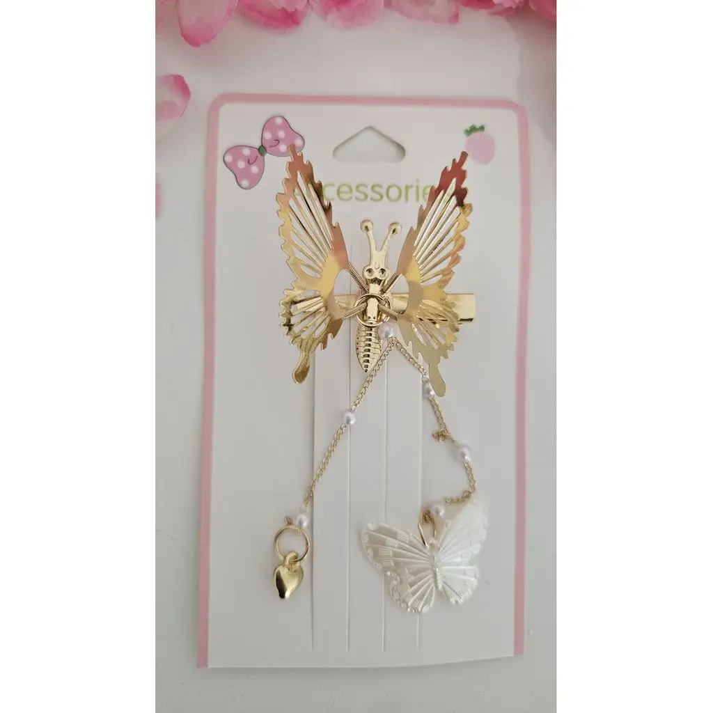 Şıklığın ve zarafetin simgesi: Altın renkli kelebek tasarımlı bu özel saç tokası, saçlarınıza hem romantik hem de sofistike bir hava katıyor.