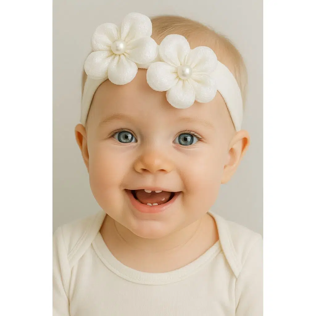 Çift çiçekli inci detaylı bebek saç bandı, bebeğinizin zarif ve sevimli görünümünü tamamlar. Yumuşak ve esnek yapısıyla yenidoğan ve 0-3 yaş arası bebekler için idealdir. İnci süslemeli şık çiçek tasarımı sayesinde doğum günü, baby shower, fotoğraf çekimi, özel gün kutlamaları ve günlük kullanım için mükemmel bir tercihtir. Cildi tahriş etmeyen, nefes alabilen kumaşı sayesinde bebeğinizin hassas cildine dosttur.