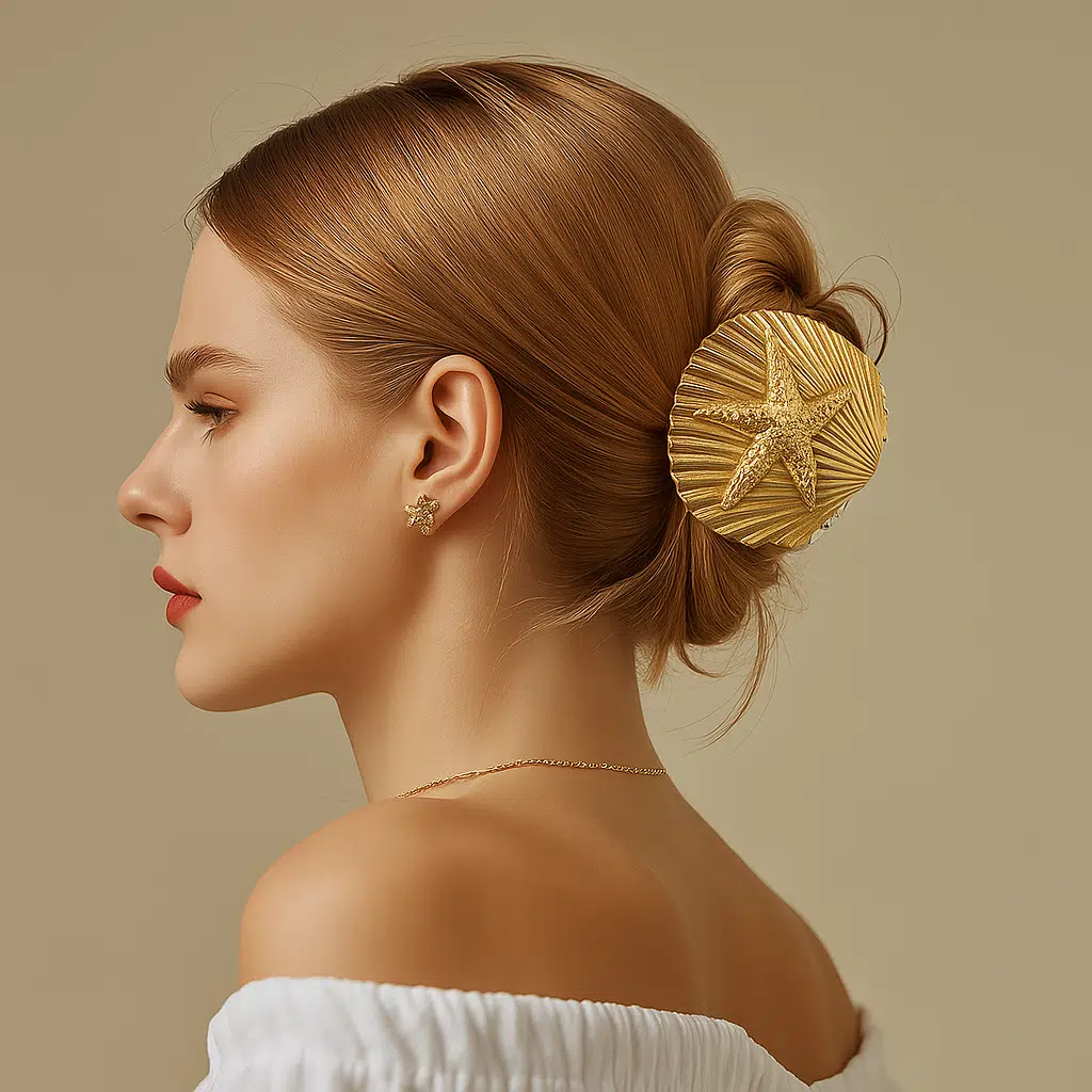 Deniz Yıldızı ve Deniz Kabuğu Tasarımlı Metal Mandal Saç Tokası, şık detayları ve parlak metal yüzeyiyle modern stilinizi tamamlar. Doğadan esinlenen zarif formu sayesinde hem günlük kombinlerde hem de özel davetlerde fark yaratan bir görünüm sunar.