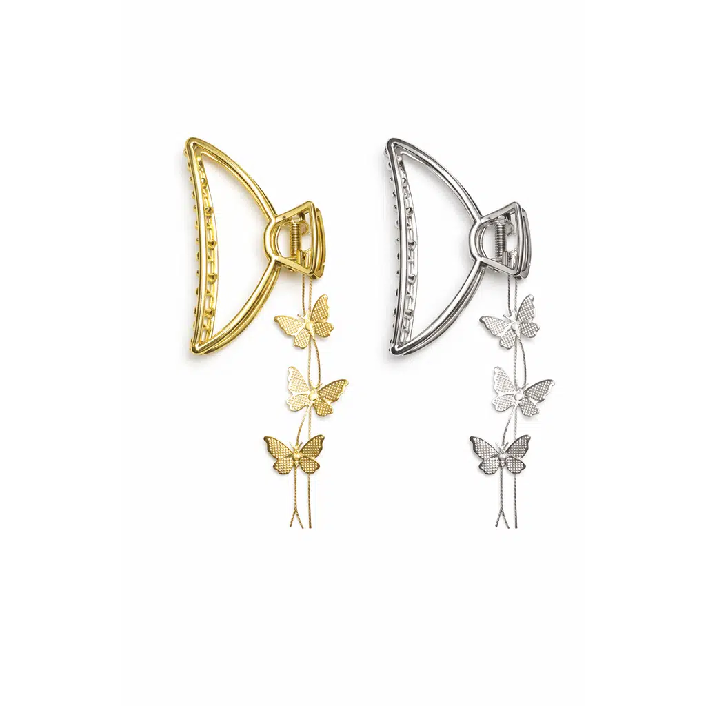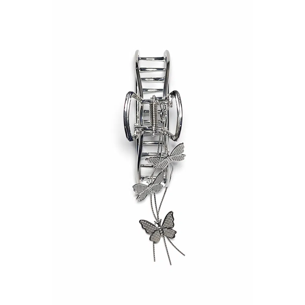 7 cm Gümüş Taşlı Kelebek Zincir Detaylı Metal Saç Tokası, kelebek figürlerinin zarif dansını andıran zincir detayı ve parlayan taş süslemeleriyle dikkat çeker. Gümüş rengi metal gövdesi, hem günlük kombinlerde hem de özel günlerde zarif bir tamamlayıcı olarak öne çıkar.