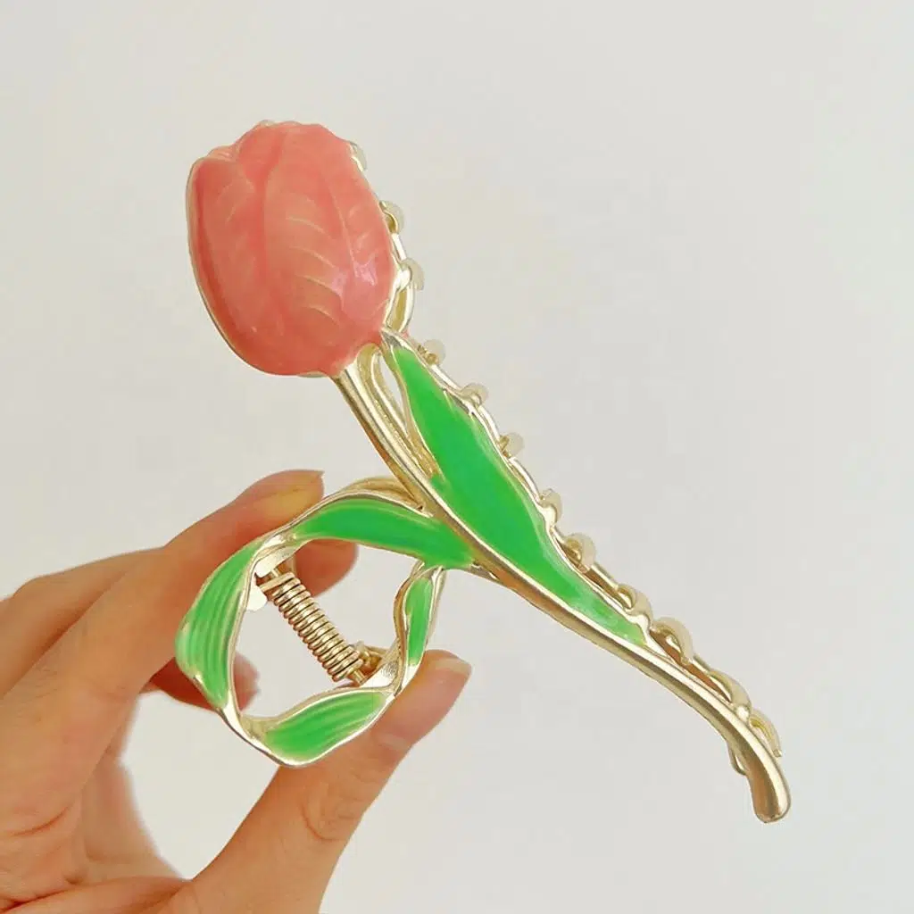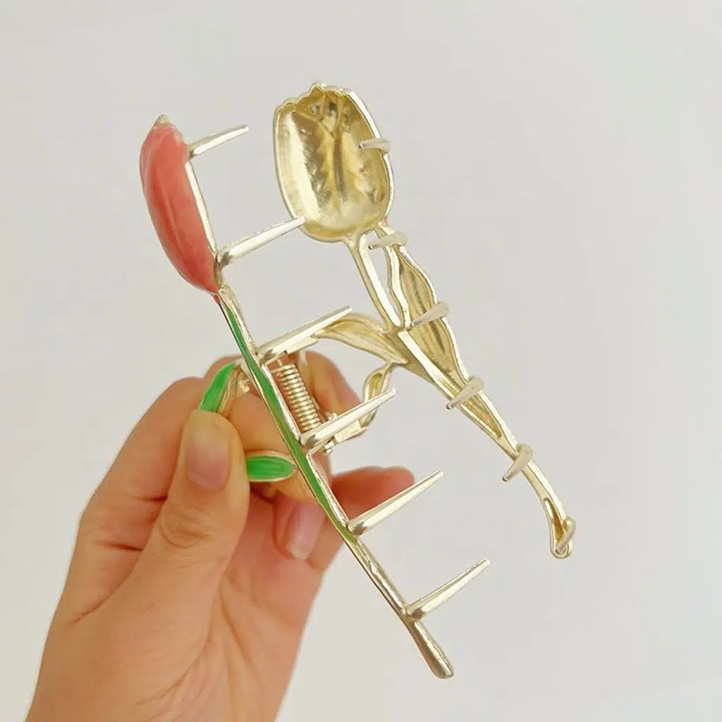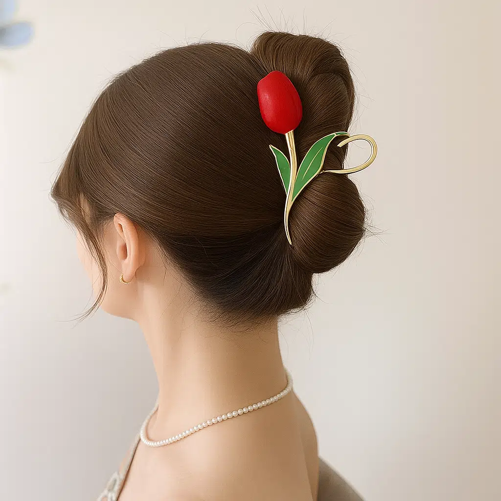 11 cm Kırmızı Lale Model Saç Tokası, zarif lale formu ve kırmızı tonuyla hem şık hem romantik bir görünüm sunar. İnce işlenmiş yeşil yaprak detayı, gold metal gövdeyle birleşerek saça zarafet ve tazelik katar.