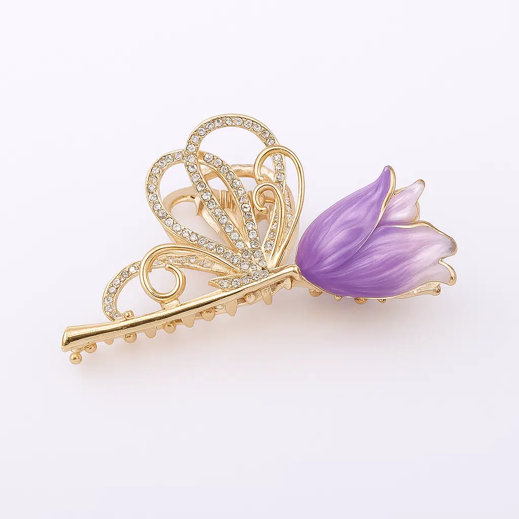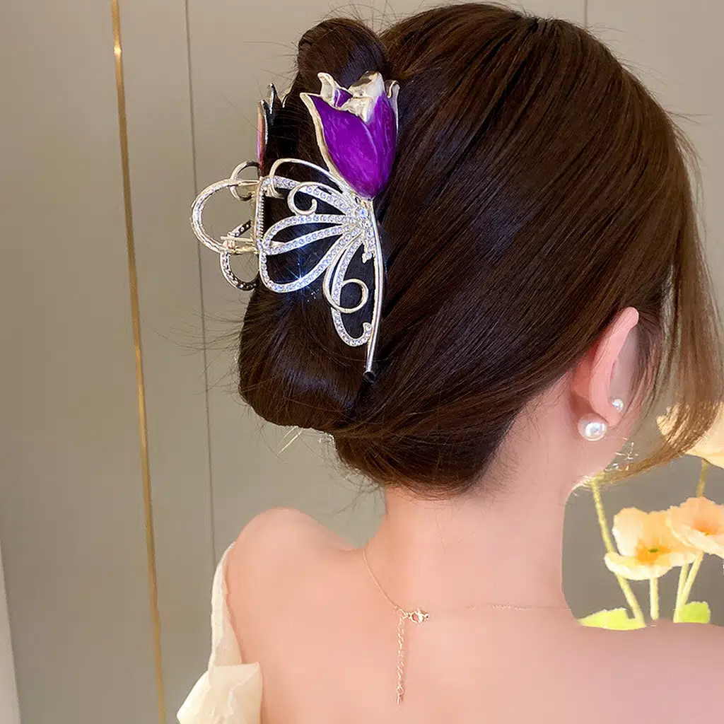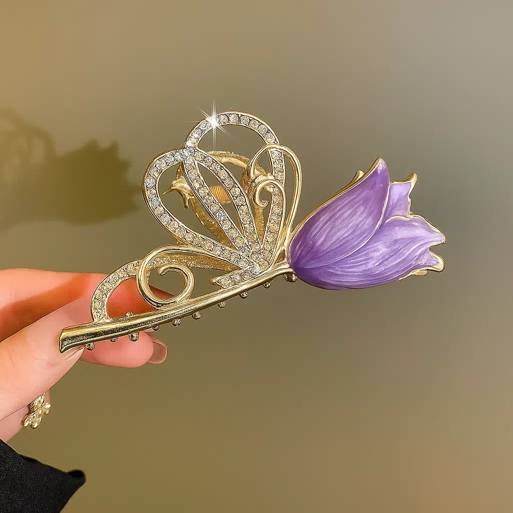 11 cm Mor Lale ve Kelebek Model Saç Tokası, zarif lale figürü ve ışıltılı kelebek kanat detaylarıyla sofistike bir görünüm sunar. Mor lalenin asaleti, gümüş tonlu metal gövdeyle birleşerek saçınıza şık bir dokunuş kazandırır.