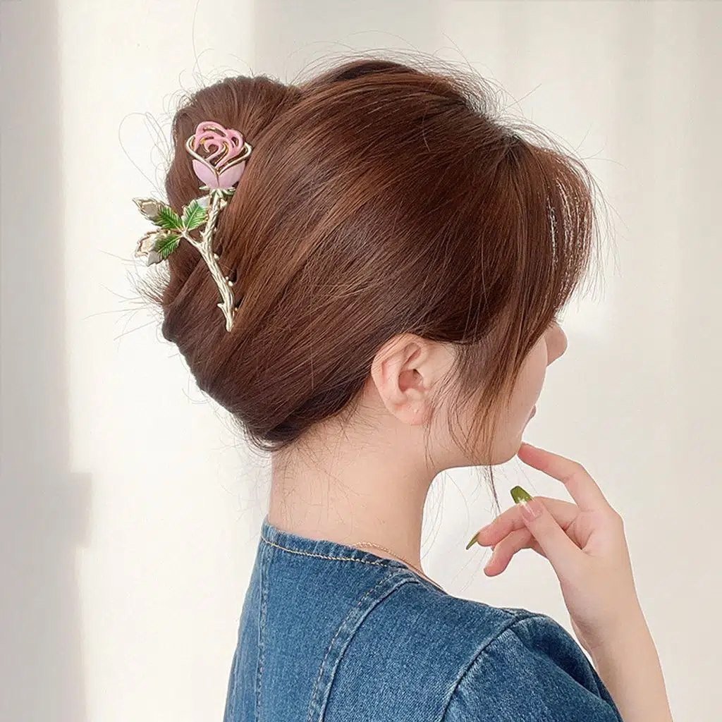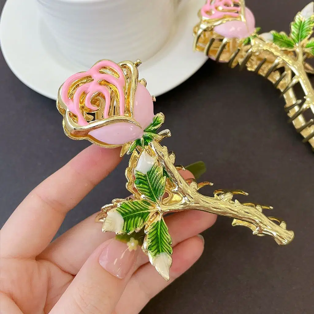 11 cm Pembe Gül Model Saç Tokası, ince işlenmiş metal sap detayı ve canlı yeşil yaprak süslemeleriyle klasik gül figürünü modern bir dokunuşla buluşturur. Pembe gül motifi, saçlara doğal bir güzellik ve romantik bir hava kazandırırken güçlü mandal mekanizması gün boyu sabit bir tutuş sağlar.