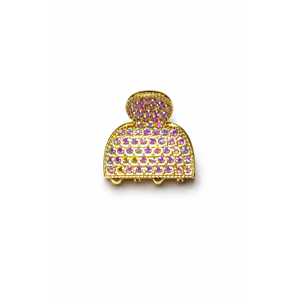 2 cm Taşlı Çan Formlu Gold Mini Kadın Saç Tokası, modern kubbe şekli ve zarif taş işlemeleriyle saçınıza ışıltı katmak için tasarlandı. Gold metal gövdesi ve çok renkli taş detaylarıyla hem günlük kullanımda hem özel günlerde sofistike bir duruş sunar.