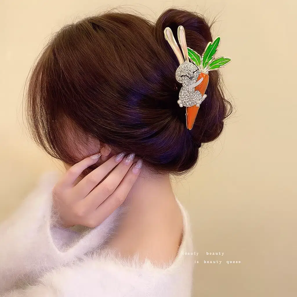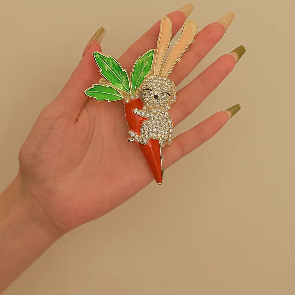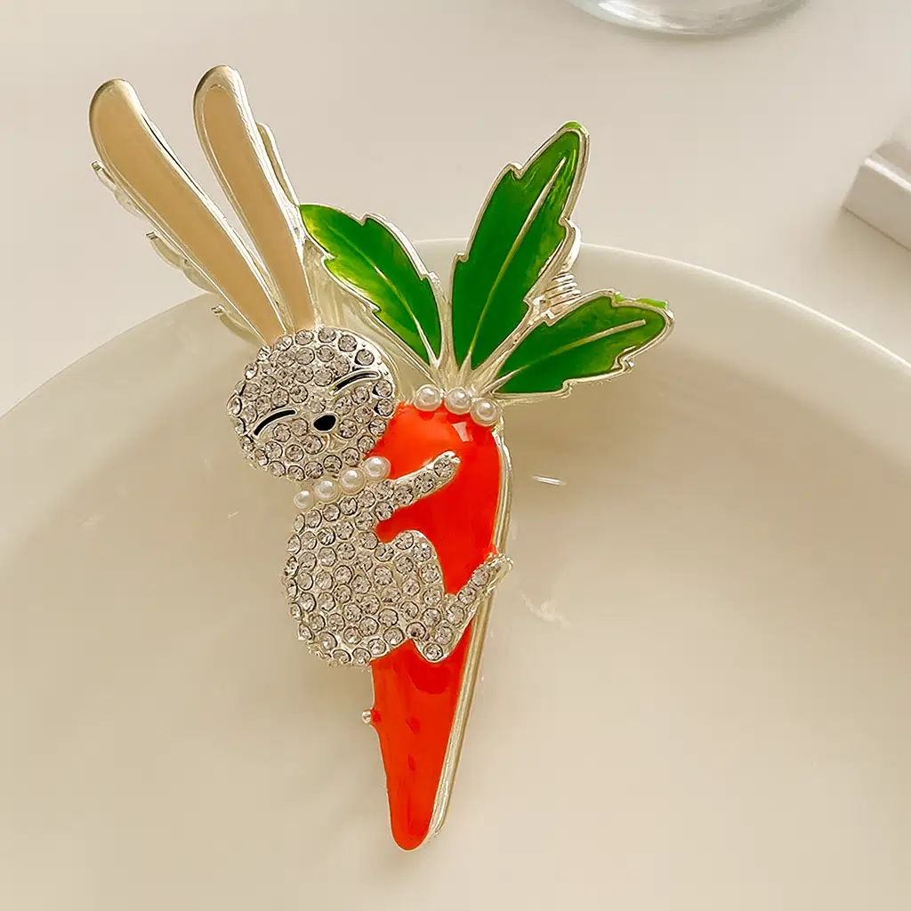 11 cm Tavşan ve Havuç Figürlü Saç Tokası, sevimli tasarımı ve göz alıcı taş detaylarıyla fark yaratıyor. Parlak zirkon taşlarla süslenmiş tavşan figürü, canlı turuncu havuç detayı ve zarif inci dokunuşlarıyla modern ve eğlenceli bir görünüm sunar.